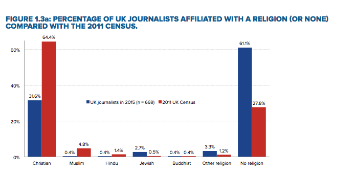Compared with the 2011 census, where 28% of Britons declared they practiced no religion, 61% of journalists claimed no religious affiliation. 31% would identify themselves as Christian, while representation of other major faiths in newsrooms were all less than 5%.